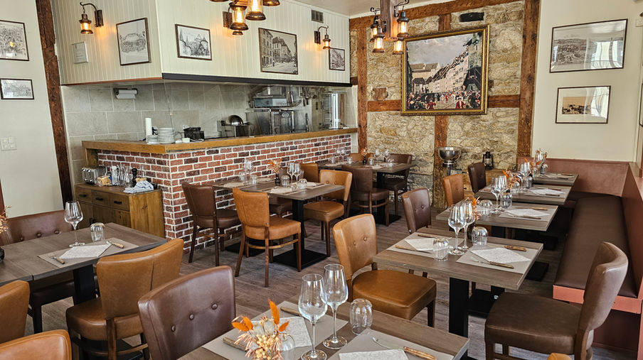 La Croix Fédérale vous accueille dans sa salle à manger au 1er étage avec vu sur la cuisine dans un cadre chaleureux ornée de photos et tableau d’époque sur la ville de Porrentruy illuminée aux lanternes le soir venu.